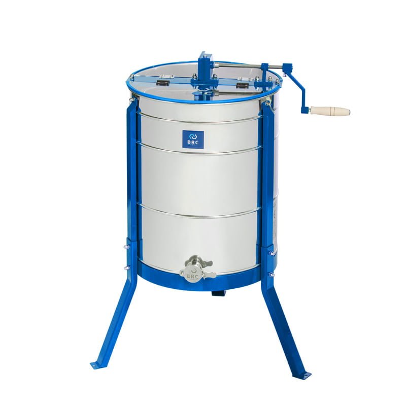 - Napęd: Ręczny z hamulcem, umieszczony na górnej części miodarki, co umożliwia łatwe i kontrolowane odwirowywanie.