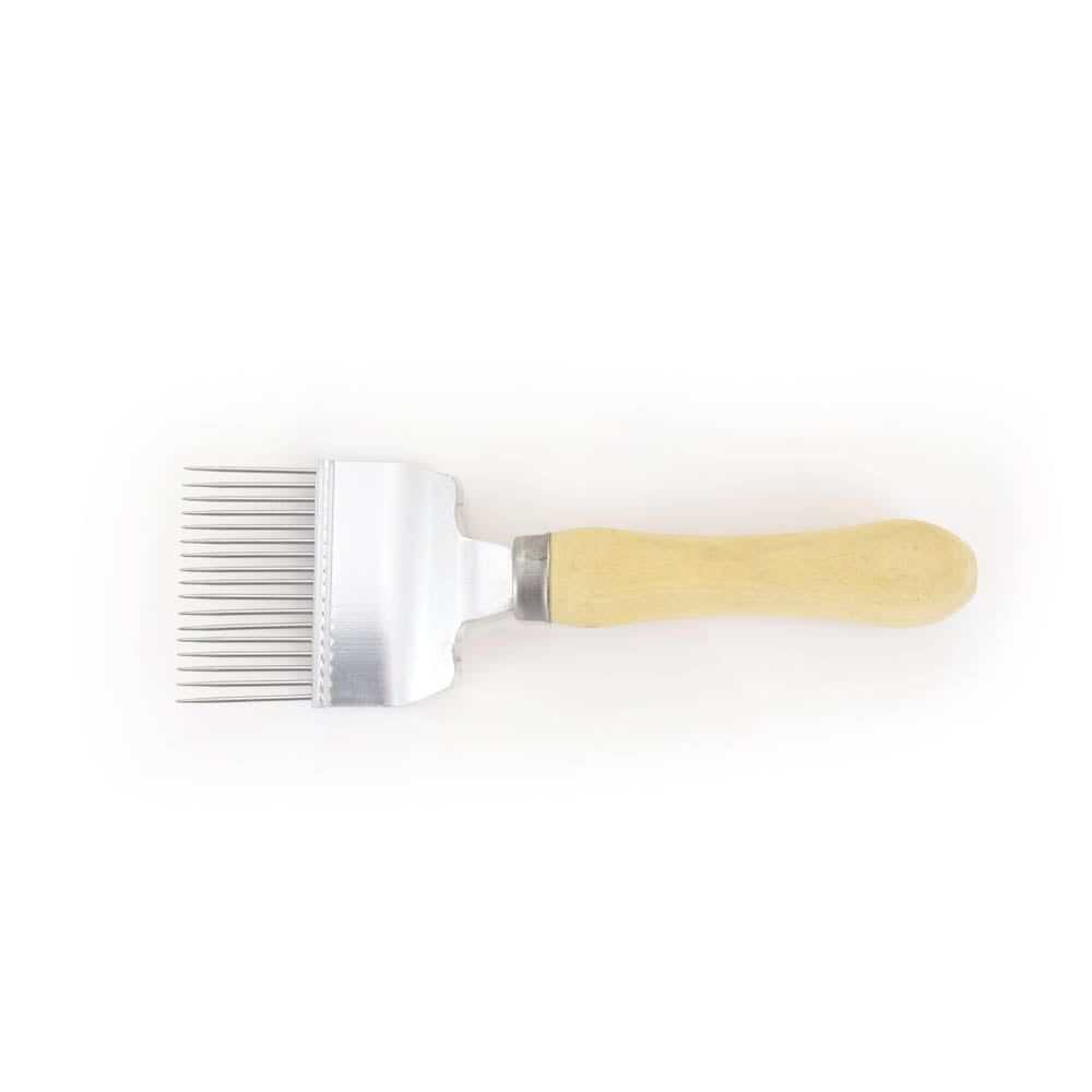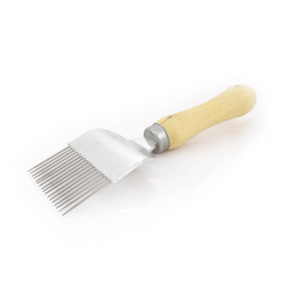 Odsklepiacz widelcowy to jedyne narzędzie pozwalające na dokładne odsklepienie ramek z miodem o nierównej zabudowie. Dzięki prostym metalowym igłom oraz poręcznej drewnianej rączce, praca przy odsklepianiu nierówno zasklepionych ramek staje się znacznie łatwiejsza i bardziej efektywna.
