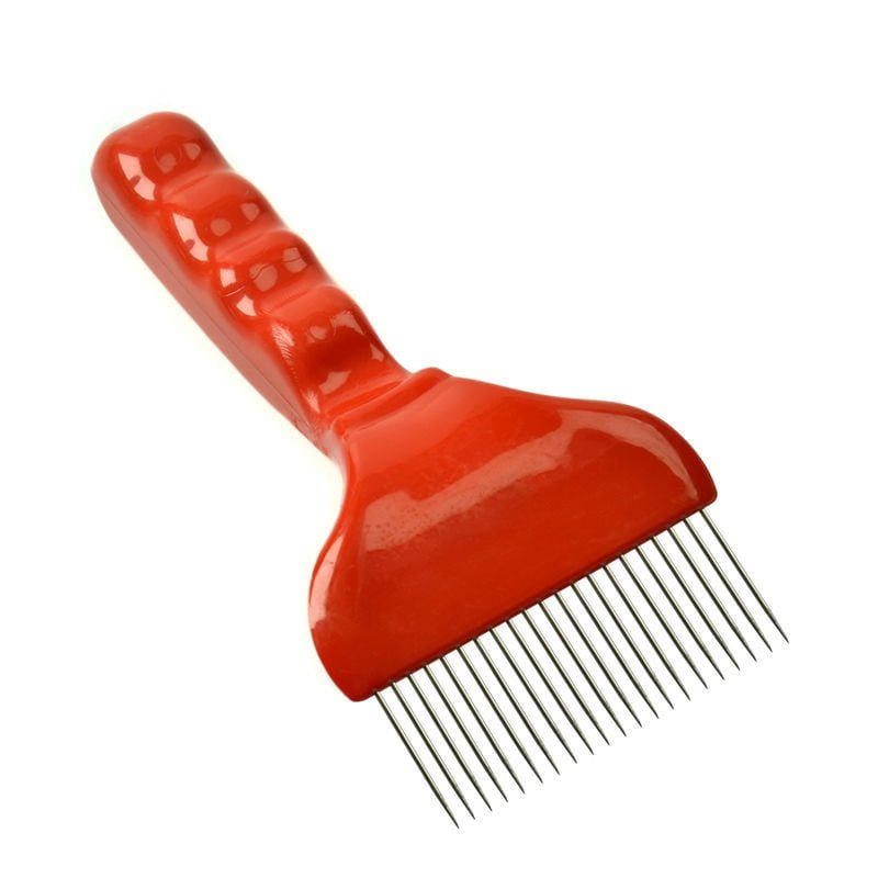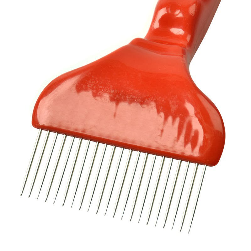 Odsklepiacz widelcowy z 21 prostymi, nierdzewnymi igłami i lekką plastikową rączką zapewnia wygodę i precyzję w procesie odsklepiania ramek z miodem.