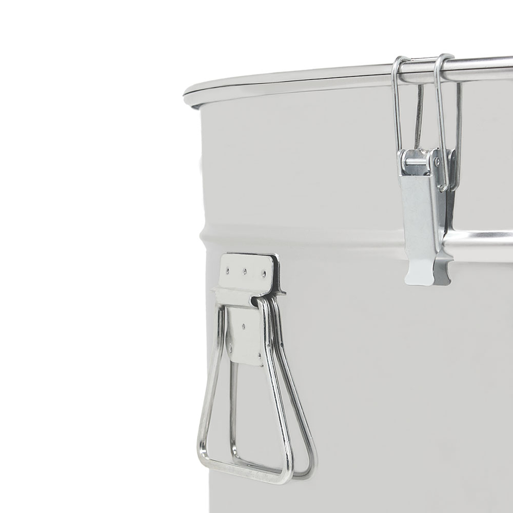 Model PREMIUM został wyposażony w praktyczne uchwyty ułatwiające przenoszenie oraz klamry, które zapewniają szczelne zamknięcie pokrywy, chroniąc miód przed zanieczyszczeniami. Nierdzewny zawór umożliwia łatwe i precyzyjne dozowanie miodu podczas jego rozlewania.