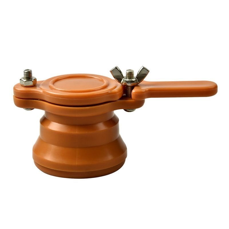 Zawór wykonany z tworzywa sztucznego. Uszczelniony gumą. Średnica ok. 4,4 cm.